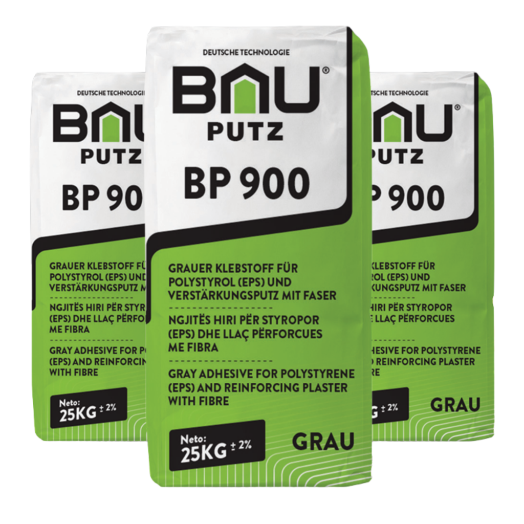 BP 900 ist Standard grauer Klebstoff auf Basis von Zement, Kalk, Qualität von Additiven und Verstärkungsfasern. Angewandt für alle Arten von mineralischen Oberflächen und Putz. BP 900 ist ein Klebstoff zum Verkleben von Wärmedämmplatten aus expandiertem Polystyrol Styropor (EPS) auf Ziegeln, Beton und der Montage von Fasernetzen über Dämmplatten. Die Oberfläche muss flach, trocken, sauber und frei von Fett und abblätternden Teilen sein. Die Anwendung ist manuell und ein Beutel BP 900 sollte mit 7–8 Litern sauberem Wasser gemischt werden. Mischen Sie es mit dem Mischer, bis eine vollständig homogene Verbindung entsteht, und lassen Sie sie 10 Minuten Zeit, um die Additive zu reagieren. Mischen Sie wieder vor der Anwendung. Die Verwendungszeit des gemischten Klebstoffs beträgt 2–3 Stunden. Während der Anwendung muss die Umgebungstemperatur zwischen +5°C und +35°C liegen. Es muss trocken aufbewahrt werden. Ablauf 12 Monate.